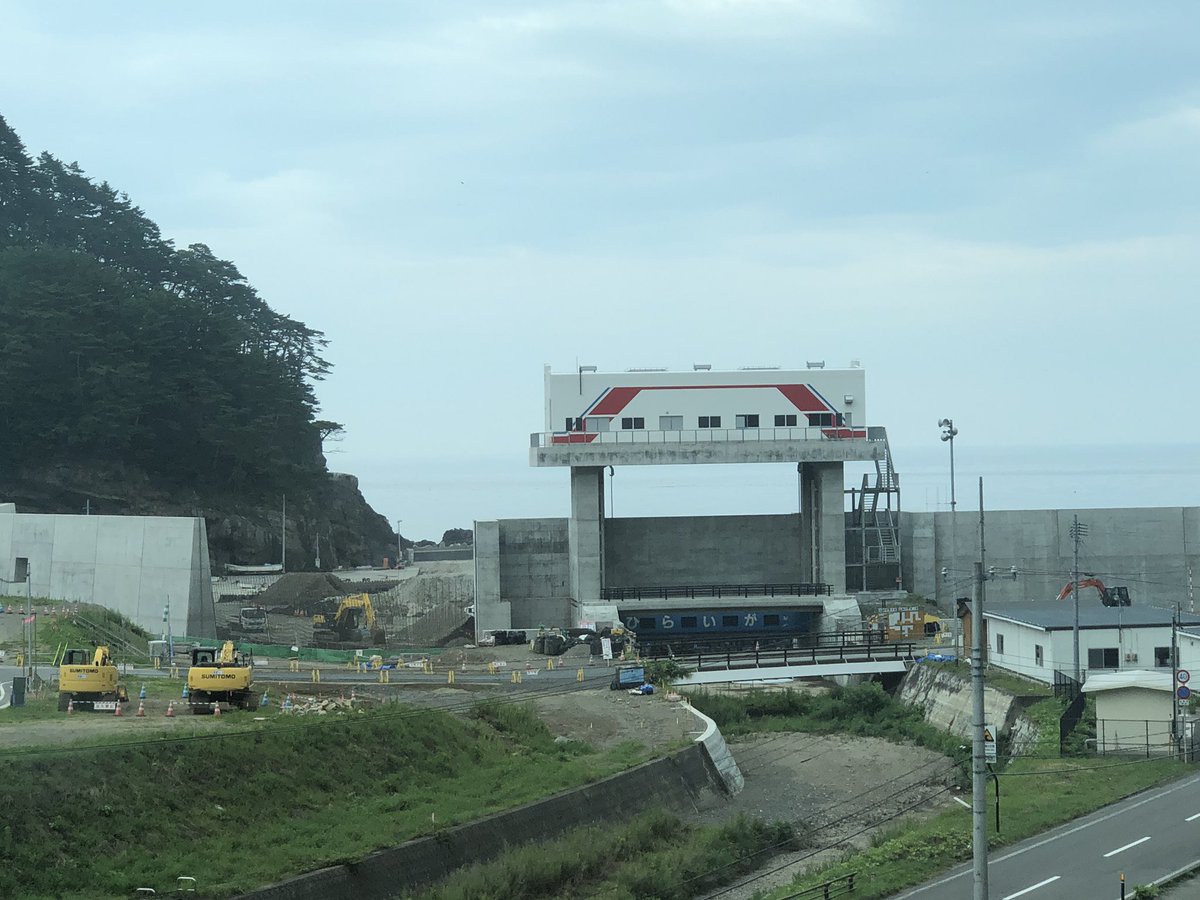 【三陸鉄道つれづれ④】島越の手前の田野畑駅から見えた平井賀川の水門(三陸鉄道の車両を模したペイントで有名)が、北山崎断崖クルーズでも見えました。これで両側が見えたことになります。
