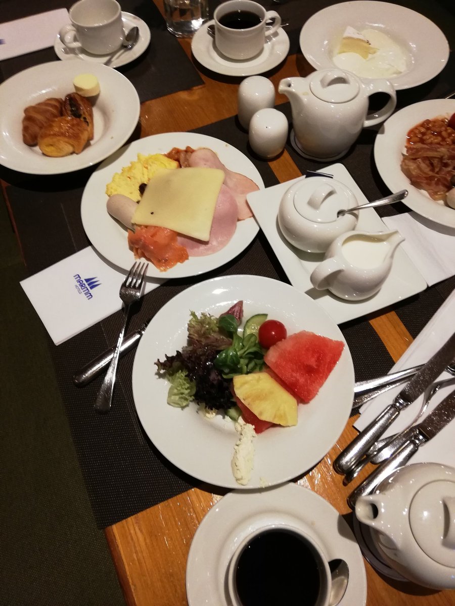 ドイツでホテルの朝食。ソーセージ、生ハム、サラミなど種類がいっぱい。毎日こんな食べていれば太ってしまう。体を動かさないと。盆踊りの練習したいな。