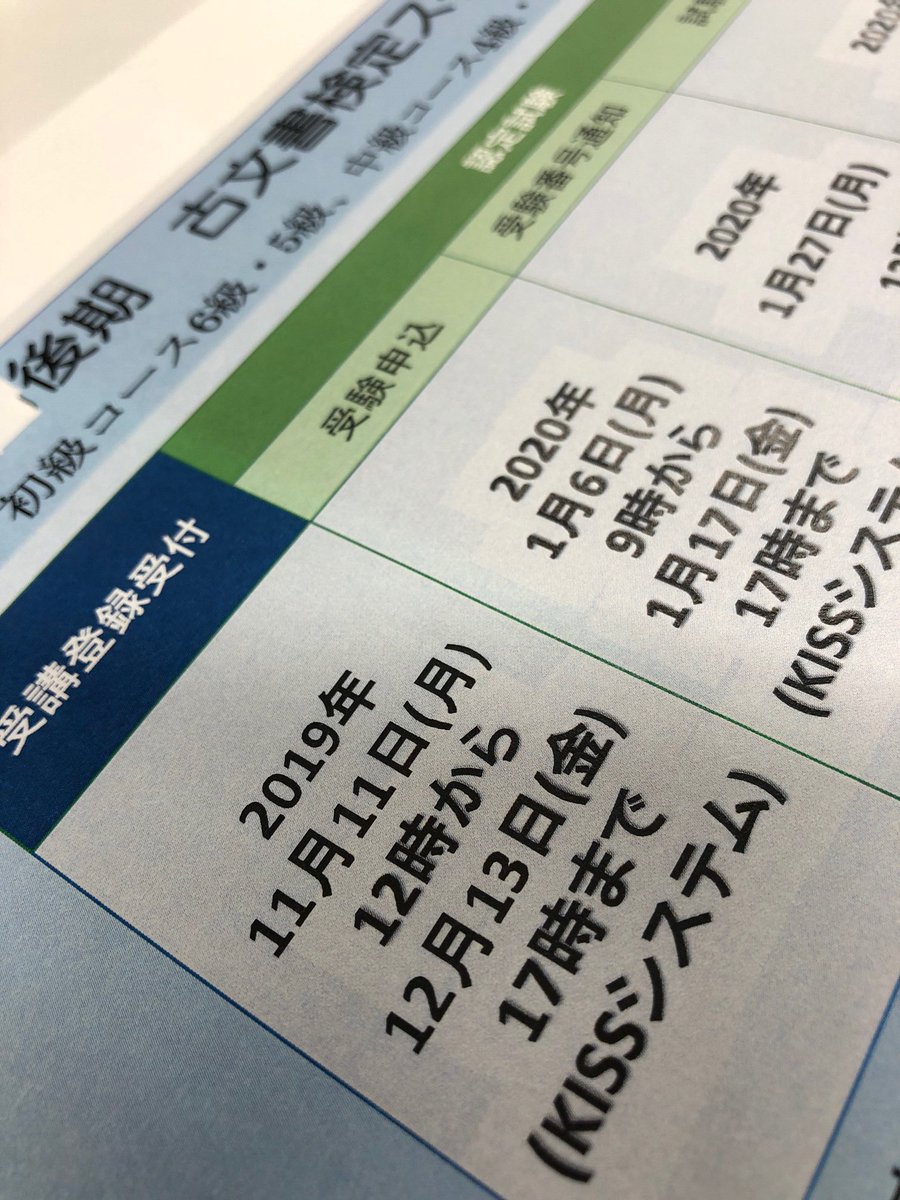 #お史ちゃん ズへ連絡です。#神戸女子大学古文書検定 後期の受講登録受付は、今週金曜日(13日)午後5時に締め切ります。 受験を予定している人は、必ず受講登録を済ませてください。 試験は、2020年1月30日(木)18時からです。 詳しくはKISSを確認してください。#神女史学科pic.twitter.com/LQD6c3VCeP
