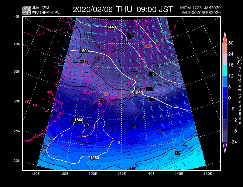 #飛び石連休寒波】まだ非常に不確実な段階ですが、2/9~2/10あたりに#立春寒波 に続く寒波が来る可能性。平地で雪になる目安の850hPa(上空約1500m)の-6℃線が本州南岸まで南下。NOAAだけでなくECMWFも予想し始めているが、気象庁GSMは寒波を予想せず。さて日本か、欧米か、軍配はどちらに‥ pic.twitter.com/DwQFDa3pY0