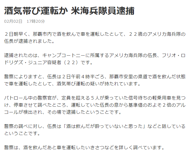 #米軍#飲酒運転#沖縄 那覇市安里の県道で酒を飲んだ状態で車を運転したとして、酒気帯び運転の疑いでキャンプコートニーアメリカ海兵隊の伍長フリオ・ロドリゲズ・ジュニア容疑者(22)を逮捕 伍長は「酒は飲んだが酔っていないと思った」などと話しているpic.twitter.com/z52tloa6xN