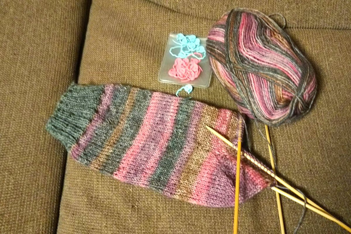 はじめてのかかとのある靴下に挑戦中。目数リングを使うのもはじめてだったけど、減目、増目だけで簡単にかかと部分出来ました。練習練習。糸はdrops。