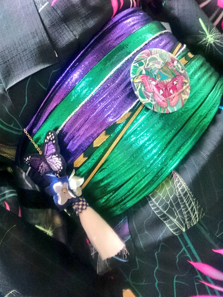 #iroca ギラヘコ#Rumirock 髪飾り#ピッコポッコ さん#花豆 さん 根付け#kimono163 さん 帯締め#ふりふ 帯留めにした缶バッチもiroca( ‘ω’)