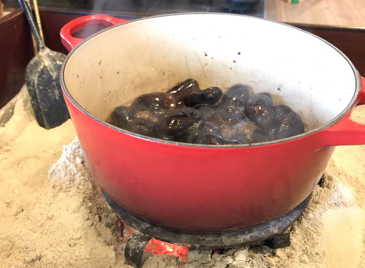 薪ストーブから熾火を長火鉢に移して 北軽井沢産の花マメを煮ます