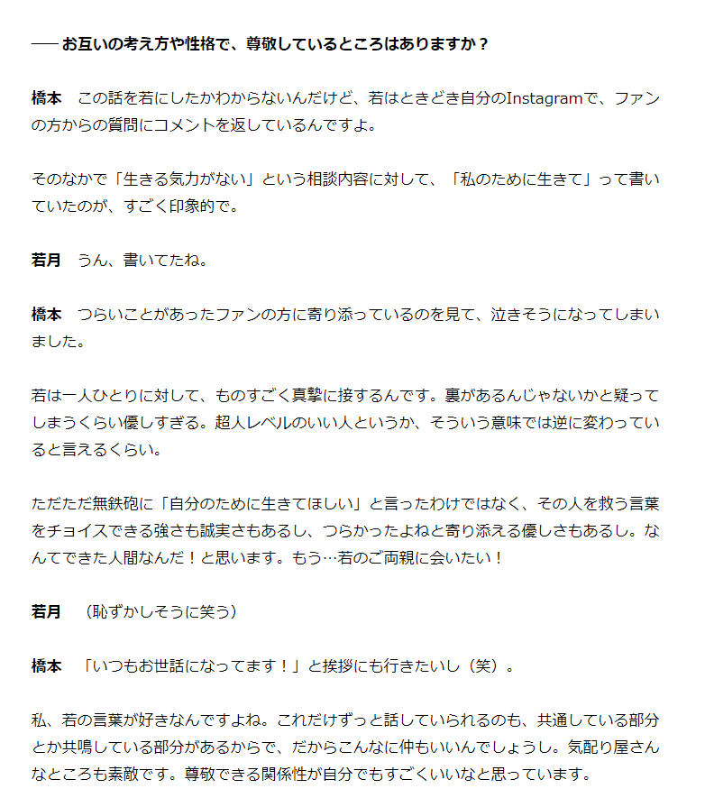 #橋本環奈「裏があるんじゃないかと疑ってしまうくらい、#若月佑美 は優しすぎる」 https://news.livedoor.com/article/detail/17742892/ … 「生きる気力がない」というファンのコメントに、「私のために生きて」と返した若月。それを見て、泣きそうになったと明かす。pic.twitter.com/XpJvkEejrx