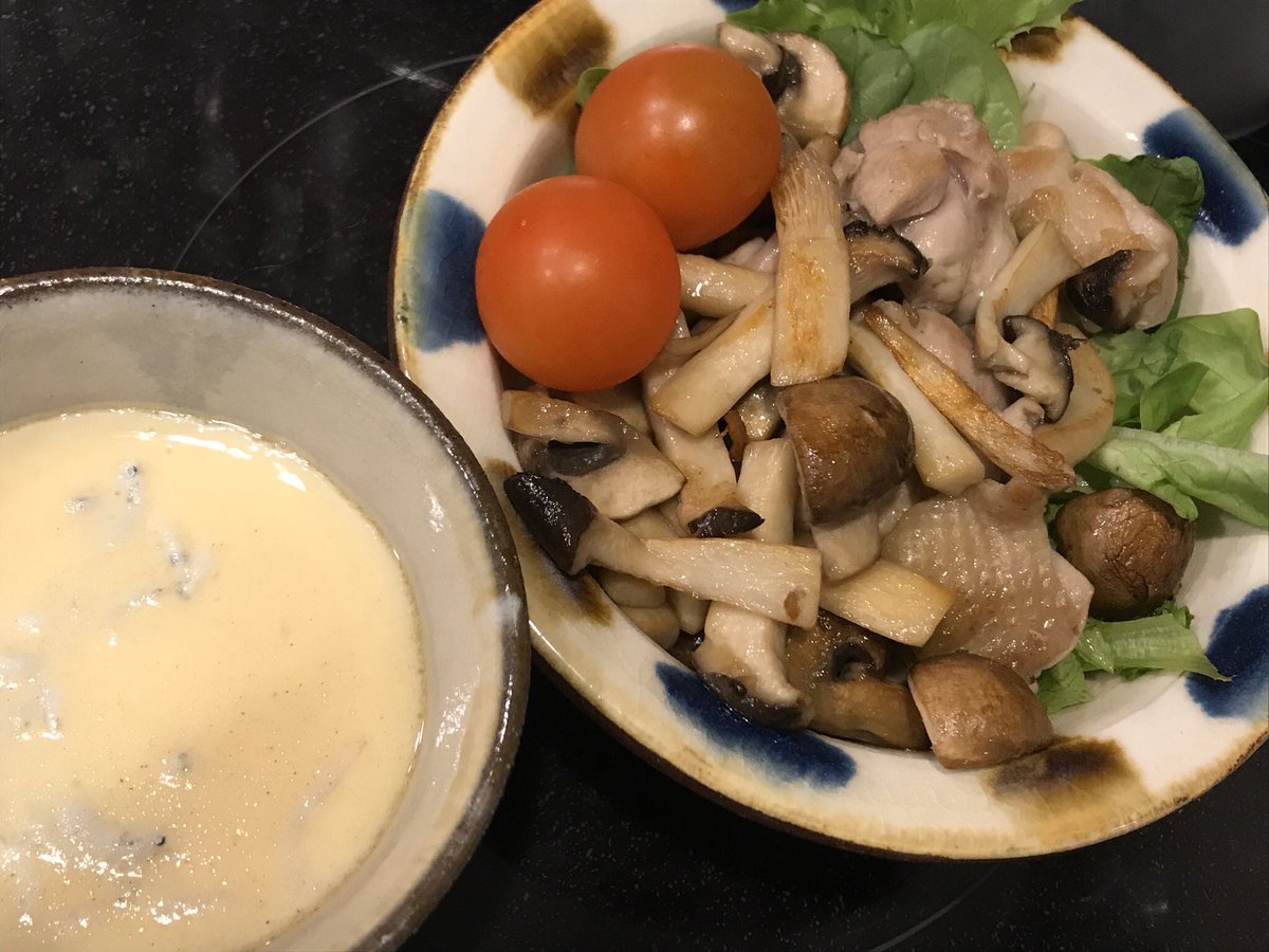 #朝ごはん#茶碗蒸し#鶏肉とキノコのサラダ#民藝#盛り付け大雑把pic.twitter.com/hsy5luqGDi