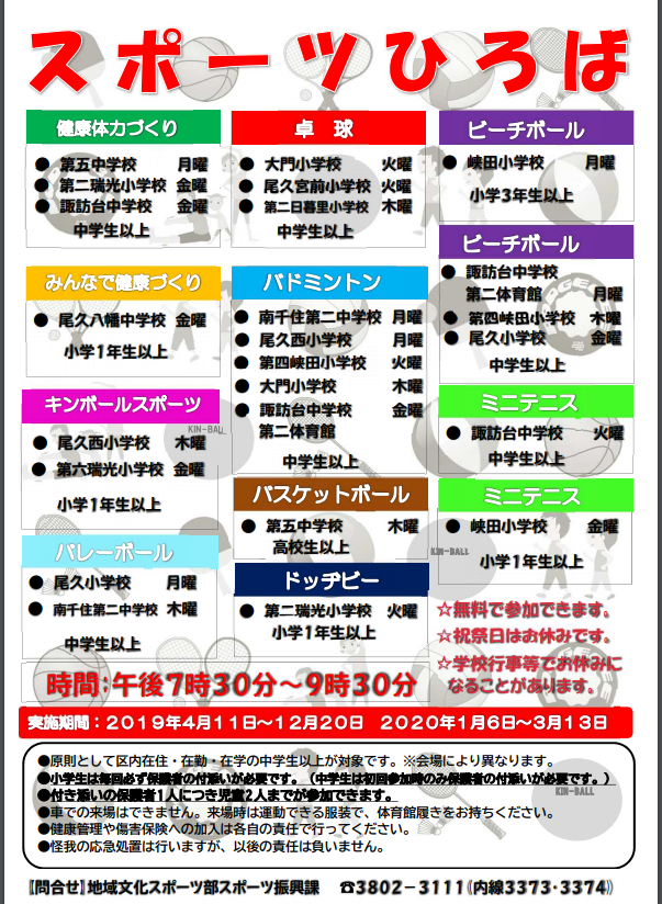 「ちょっと遊び感覚でスポーツしたいと思うけど、場所も相手もいない。」と思っていたら、 「スポーツひろば」っていう企画?(仕組み?)があることを初めて知った。 一人でも参加できるはずと思うけど、明日、区役所に聞いてみよう。