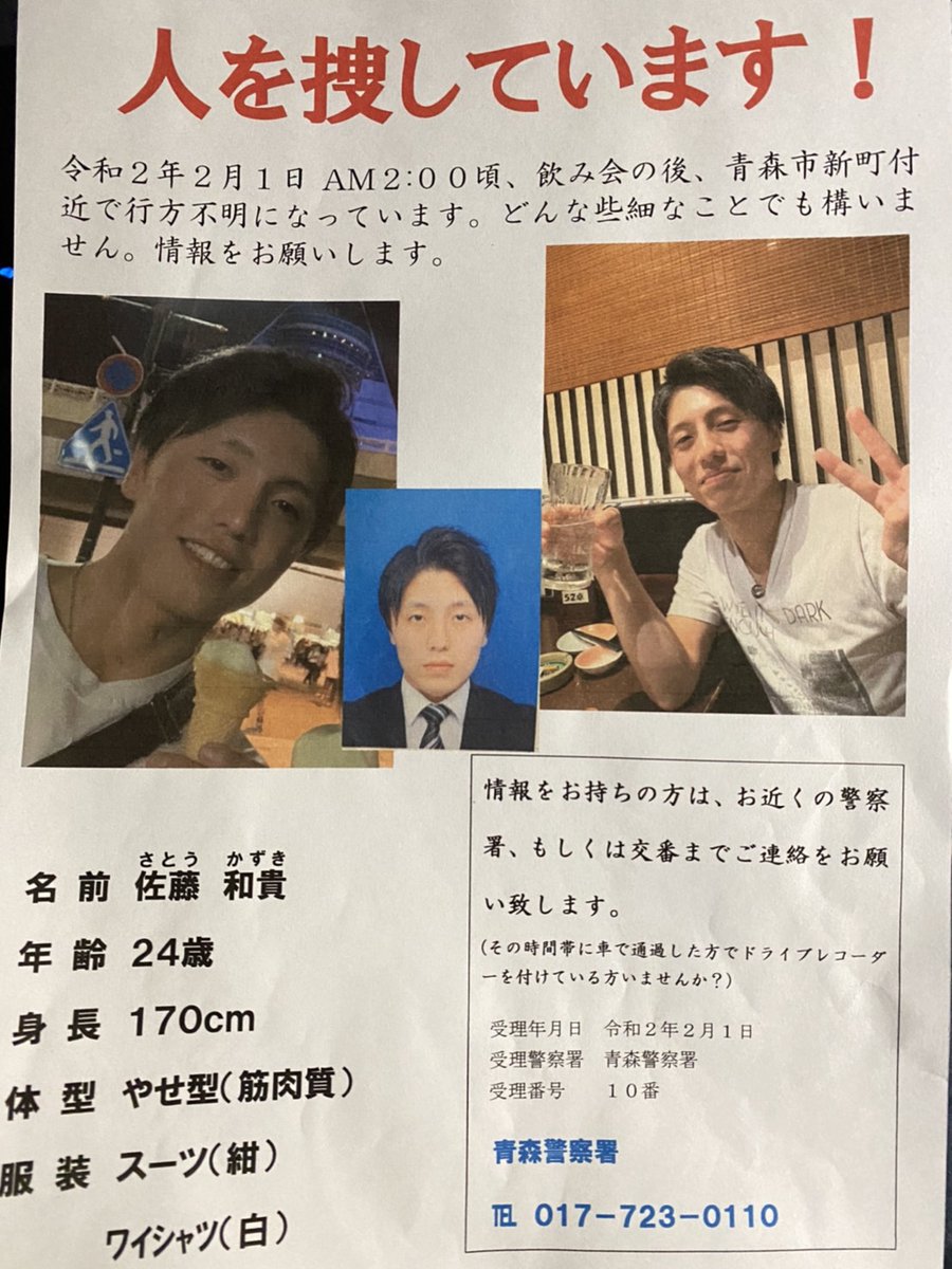 昔一緒に働いてた仲間が2月1日午前2時から行方不明になりました。 場所は青森市新町付近です。 警察にも行方不明届けは出ています。 受理番号 10 青森警察署 017-723-0110 少しの情報でもいいのでよろしくお願いします。 拡散もよろしくお願いします。