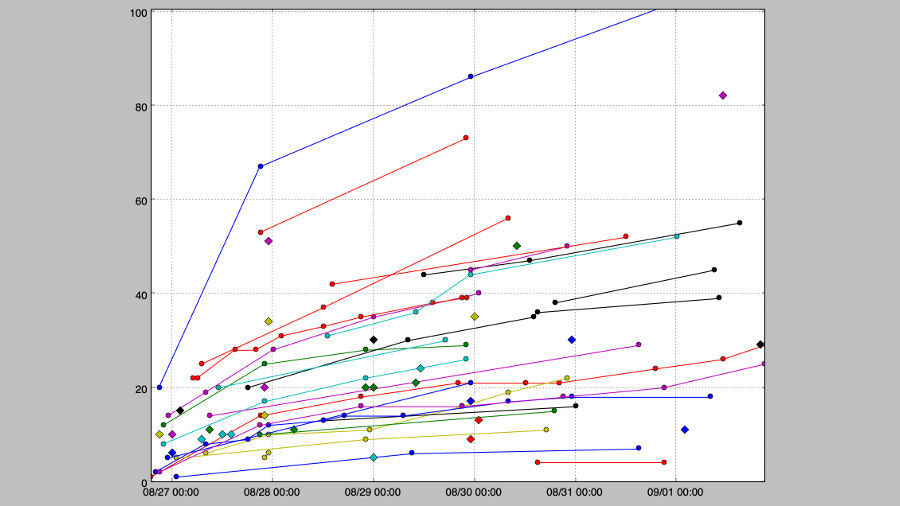 #技術書典#被チェック数予想 現時点でツイートから抽出できたチェック数をグラフ化してみました。既にグラフから飛び出てるサークルさんがいるのはご愛嬌。 被チェック数は一般公開情報じゃないのでもっとツイートしてくれると喜びます(私が) pic.twitter.com/eNwWlvvy9r