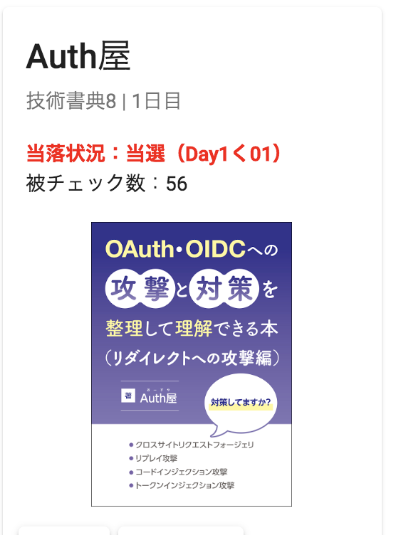 #被チェック数 562 OAuthわからん。OpenID Connectわからん ↓ 3F「お60C」Auth屋の本を読む ↓ 朕こそOAuth也#技術書典 https://techbookfest.org/event/tbf07/circle/5192018854674432 …pic.twitter.com/tDchkssauf