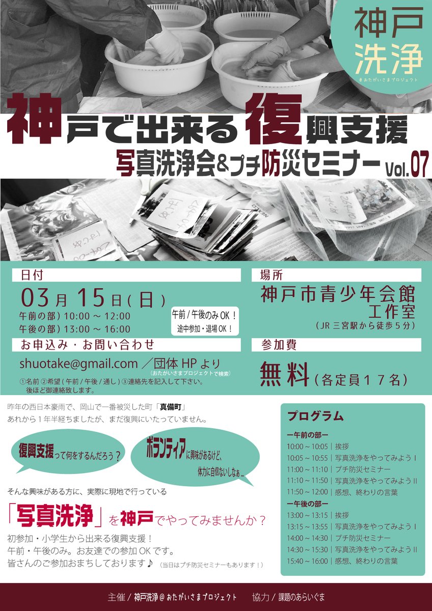 【神戸で出来る 復興支援!写真洗浄会&プチ防災セミナーVol.07_3/15(日)】 今も消えつつある、被災者の大切な思い出を、一緒に守りませんか? 小学生から参加可能!親子連れ、学生、友人参加OKです!
