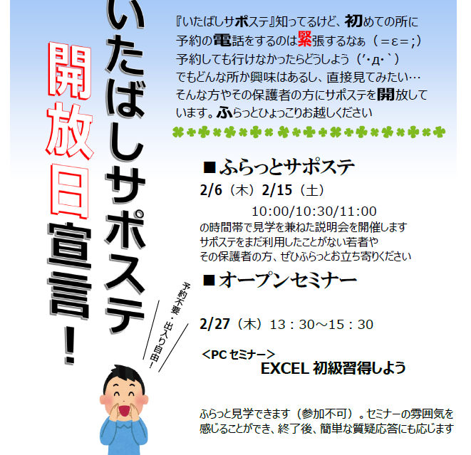 2/6(木)フラッとサポステの日です。 10/10:30/11:00の時間帯でサポステの説明会を行います。 サポステを利用した事の無い方で、まずはサポステの内容を聞きたい方!予約不要なので直接お越しください!