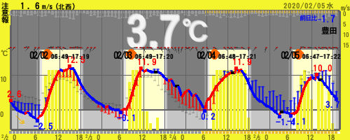 2. 【19:00時点 3.7℃】 10.0~-1.4℃ (西部)★注意報:強風/乾燥(東部)★注意報:乾燥 =愛知県豊田市