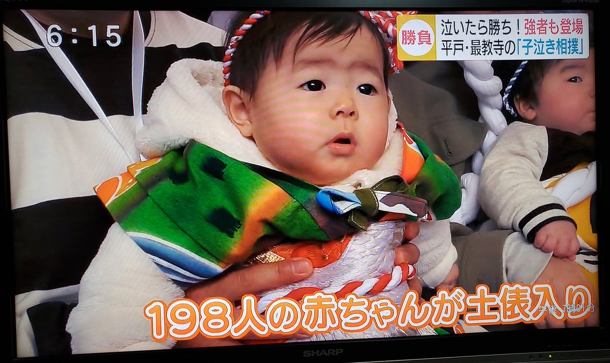 平戸では節分の日に「子泣き相撲」という行事をやっていて、娘のために朝4時半から並んで順番待ちして来ました