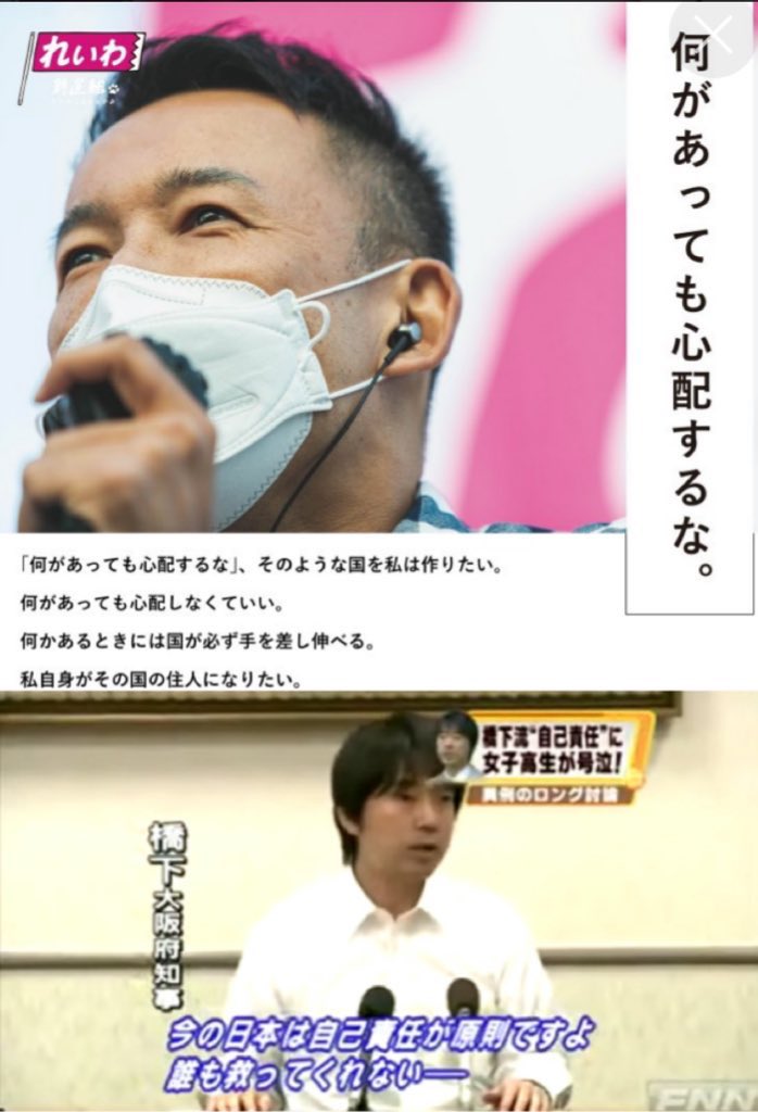 #橋下徹「今の日本は自己責任が原則。誰も救ってくれない」#山本太郎「何があっても心配するな。そんな日本をあなたとつくりたい。」 橋下徹は過去の遺物。山本太郎は新しい時代の象徴。新旧の闘い、自助と公助の闘いだ。小さな政府か大きな政府か。それとも、#身を切る改革 か#身を守る改革 か。pic.twitter.com/WfQjuM1ODt