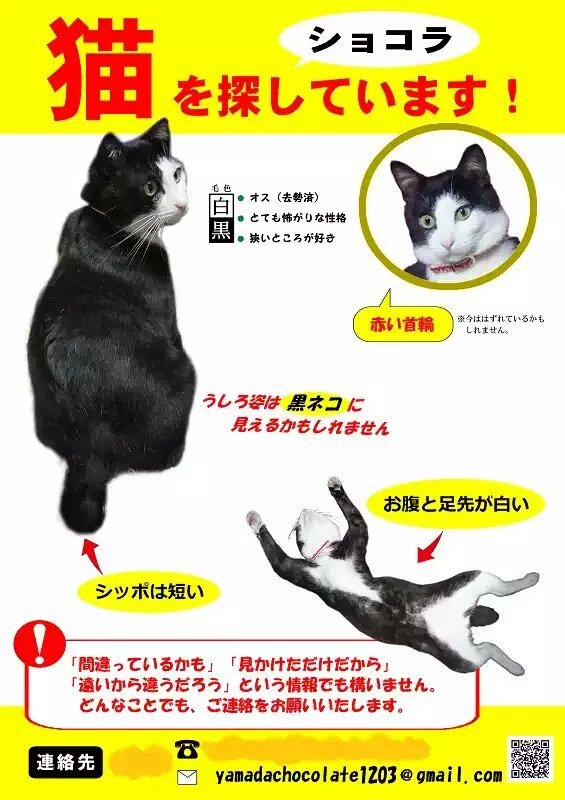 いつもRTして下さり感謝です。ショコラ/白黒/短いシッポ/去勢済オス/9歳くらい(不明時4歳)/当時は赤い首輪を着用 とても臆病なので無理に保護しようとせず連絡だけでもありがたいです。ご協力をお願いします。