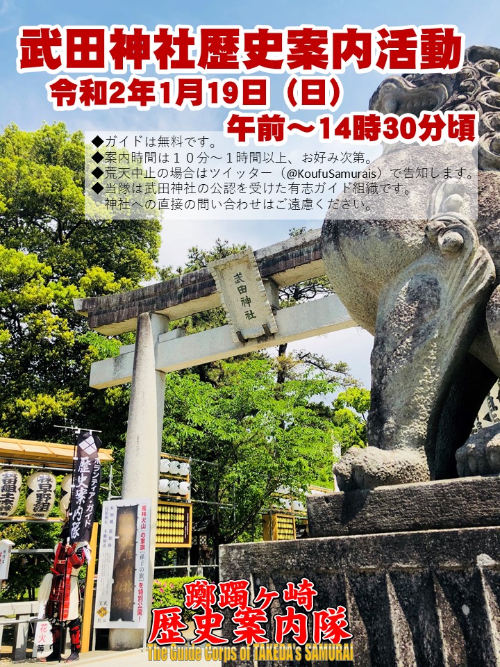 #武田の館市 は中止となってしまいましたが、19日(日)は#躑躅ヶ崎歴史案内隊 の皆様が#武田神社 へ出陣されておりますよ
