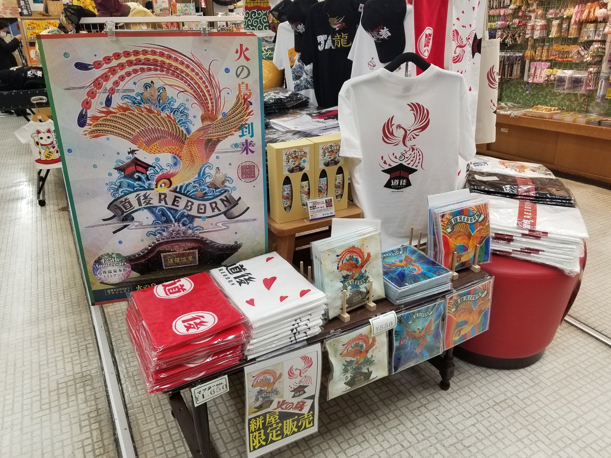 道後温泉の商店街ではREBORNプロジェクトのフラッグやオリジナルグッズも販売されています。これがなかなか欲しくなるデザイン。マフラータオルやポストカードやTシャツやトートバッグやサイダー…etc。