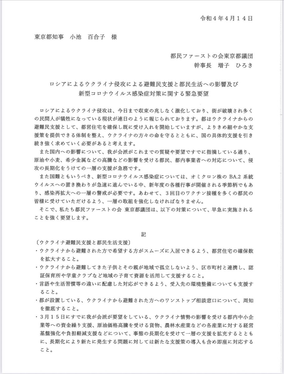 本日小池百合子都知事にウクライナ避難民支援および原油価格高騰などによる都民生活への影響に対する支援について要望書を手交しました。現在、8組17名のウクライナから都営住宅の受け入れ。きめ細やかな支援を求めました。