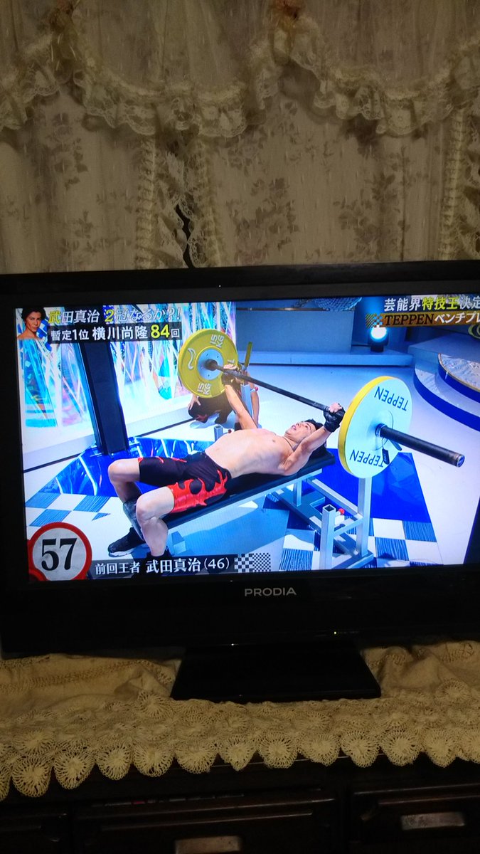 ベンンチプレス対決50kg1位は84回 、武田真治(47歳)は2位70回?凄かった。
