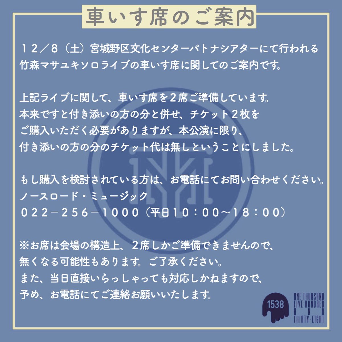 12/8(土)「#竹森マサユキ SPECIALワンマンLIVE〜THE HAPPY〜」 ■会場:宮城野区文化センターパトナシアター ■時間:開場17:30/開演18:00 ■料金:指定席¥4,000 ■先行物販:16:00〜17:00 〈チケット〉 各種プレイガイドにて販売!#開催まであと4日#チケット残りわずかpic.twitter.com/ErXKNsxgxI