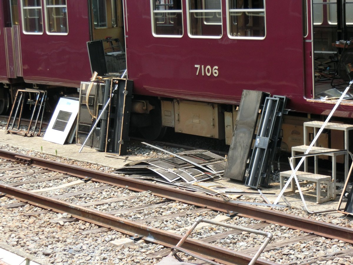 #茶色い電車#阪急電車#正雀車庫 2代目京とれいん候補の7006Fの現在。内装は派手に外されています。戸袋より天井寄りの車内LED表示はそのまま?できれば7001Fに移植して欲しいかなと思ってみたり…pic.twitter.com/1xx7ppG2MR