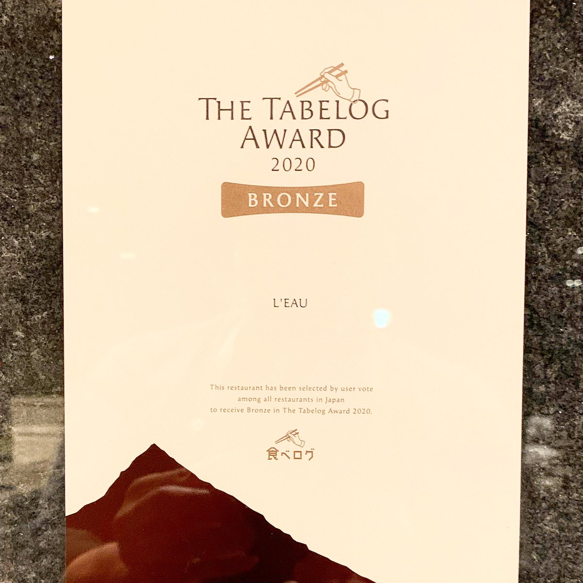 The Tabelog Award The Tabelog Award 2020 皆様のおかげで食べログアワード2020にてブロンズを頂く事ができました! L’EAU初の賞で嬉しいです。 ありがとうございます!!