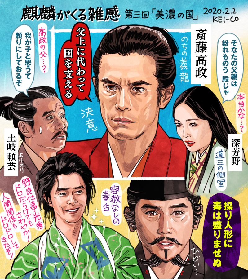 麒麟がくる第3話。頼純亡きあと守護の座に就いてほしいと頼芸に願い出る道三、毒を盛らずともマムシの毒舌ぶりは圧巻でした。本当の父は頼芸ではないかと疑い、道三に代わり美濃を支える決意をする高政。一筋縄ではいかない土岐家と斎藤家。光秀がどう動いていくのか楽しみです。