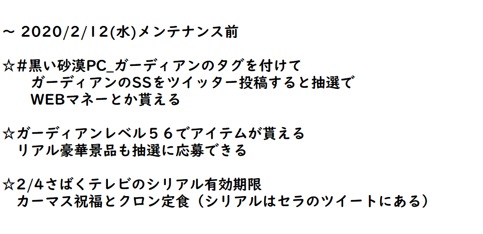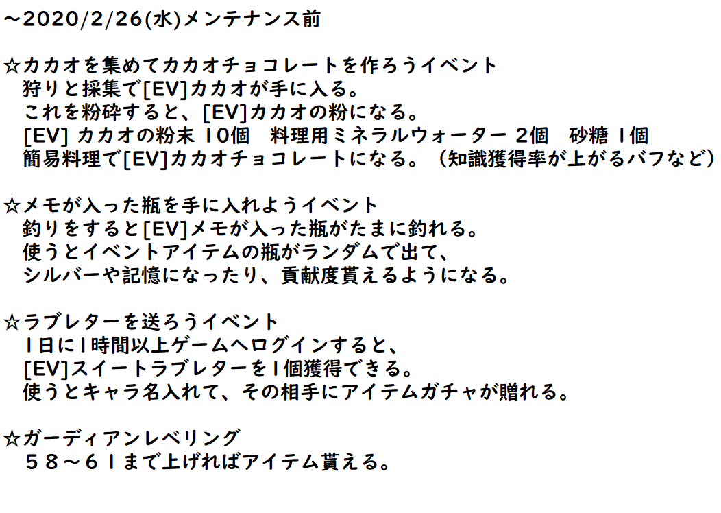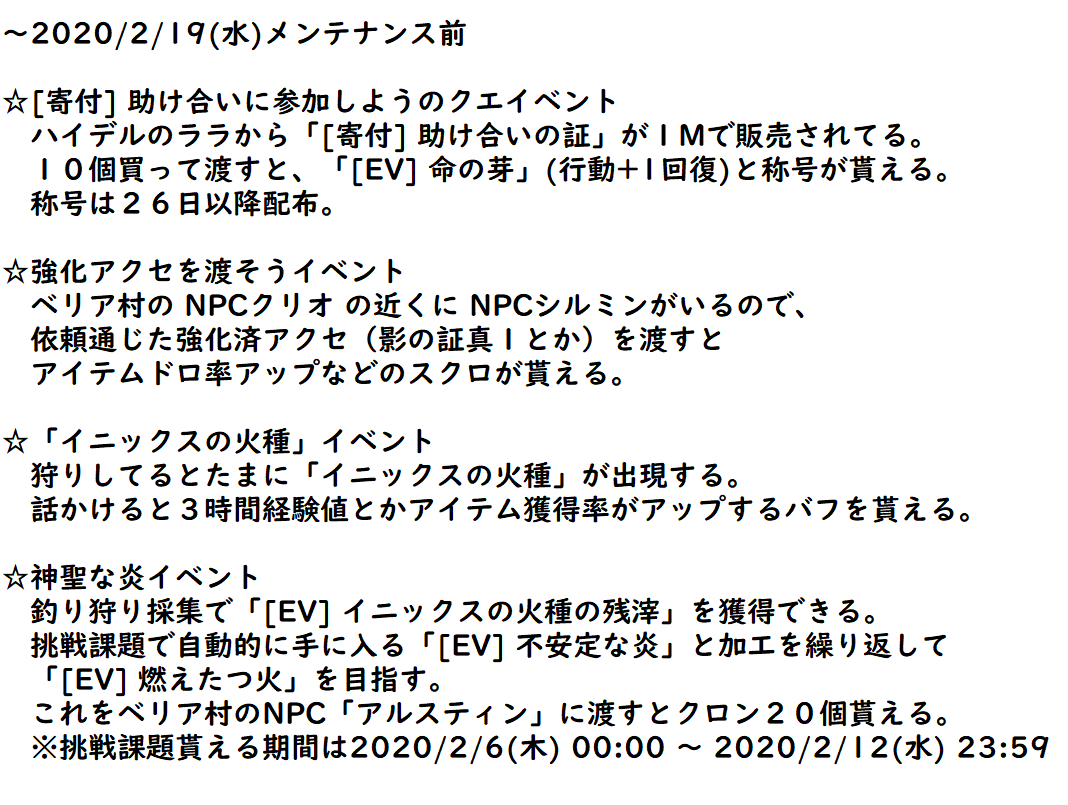 2月5日メンテ以降来たイベのまとめ! 毎度毎度抜けてたり間違ってたりすることがあるので申し訳ない・・・ それとたまにいつの間にか期間が変更されてたりするのヤメレ