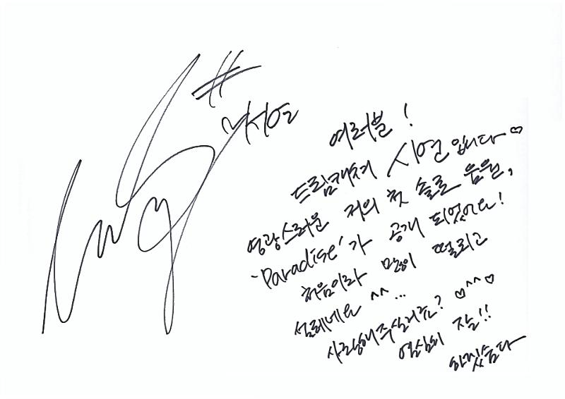 Siyeon's handwritten letter in Naver post: Everyone! It's Dreamcatcher Siyeon ♡ My glorious solo 'Paradise' has been released! It's my first so I'm very nervous and excited ^^ ... You'll give it love right? ♡^^♡ I'll work hard and well!!