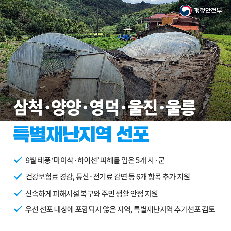 #태풍#마이삭#하이선#특별재난지역_선포 5개 시·군·구, 19개 읍·면·동 특별재난지역 추가 선포로 피해수습을 지원합니다. 피해시설복구와 피해주민 생활안전 지원에 최선을 다하겠습니다. 자세히 보기