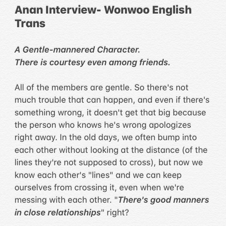 #세븐틴#WONWOO#원우 Interview Trans We know each other's "lines" and we can keep ourselves from crossing it, even when we're messing with each other. "There's good manners in close relationships" right? kr trans: wandoobeanxx pic.twitter.com/nROJ2rBmrR