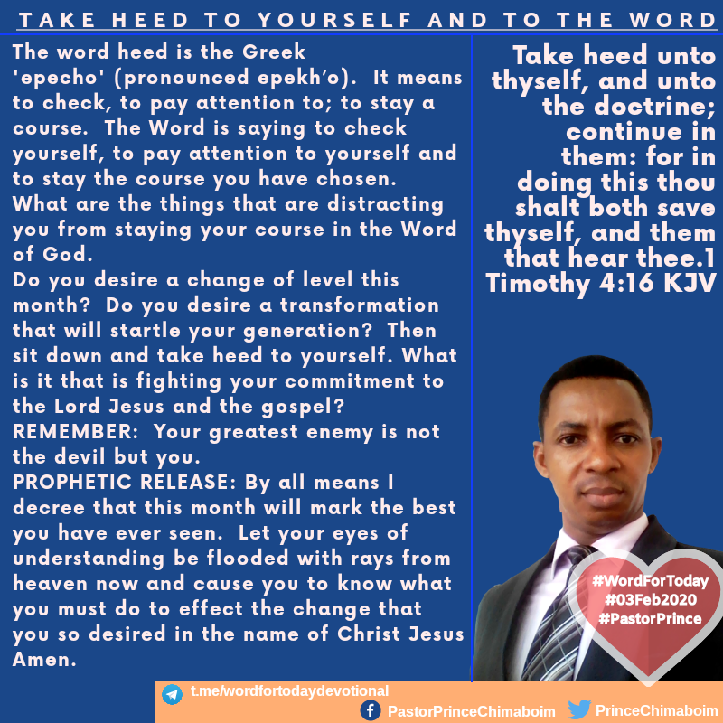 #WordForToday#03Feb2020#PastorPrince Read today's full devotional on Facebook: https://web.facebook.com/photo.php?fbid=10215377712891760&set=a.2321951683962&type=3&theater … Telegram:. WordForTodayDevotional WordForToday Devotional is the best way to start your day. https://t.me/WordForTodayDevotional …pic.twitter.com/4TEsVPqhnc