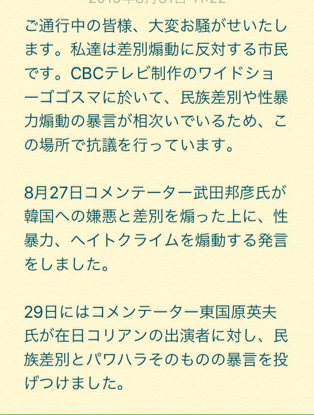 #0831ゴゴスマ打ち切れ CBC名古屋本社前の抗議行動には、『ネットと愛国』などの著書で知られるジャーナリストの安田浩一さんの姿が。 「今日は取材ではなく、私自身が抗議したいと思ってここに来ました。」 「差別と扇動がなぜ許せないか。それは、その向こうに戦争と殺戮が見えるからです」 pic.twitter.com/jTI4DB8SR3