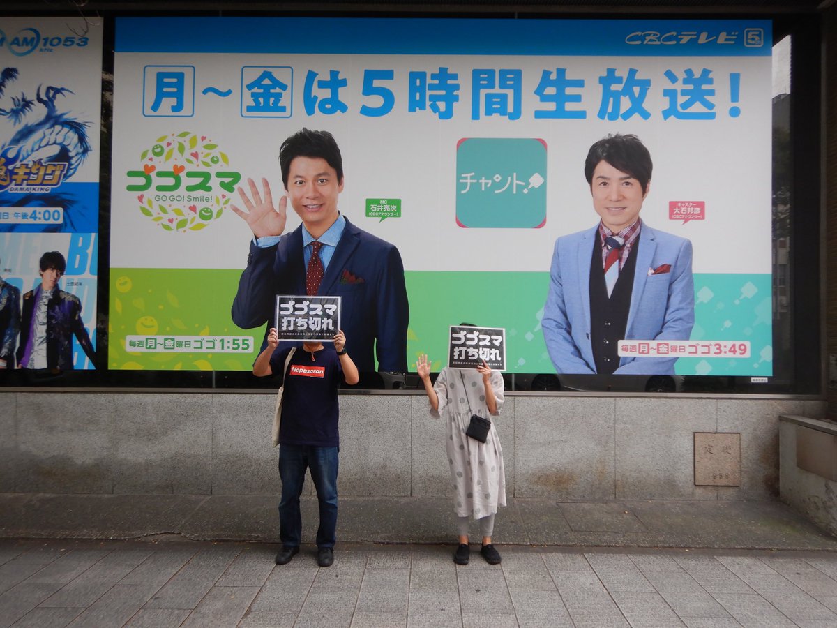 #0831ゴゴスマ打ち切れ によっぽど行こうかと思ったが行けなかった。その後#ゴゴスマ はお茶を濁すだけ。そこで今回の愛知訪問の機にゲリラ抗議をと考え少人数でスタンディングした。番組ポスターがデカデカと掲げられたままなのを現地で見て全く反省の色など無い事を改めて知った#ゴゴスマ打ち切れpic.twitter.com/xizhlMhFtG