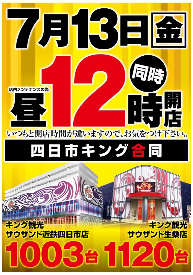 #キング観光サウザンド近鉄四日市店 です#いつもと時間が違う 7月13日(金)は#四日市キング合同#12時開店 先着順での入場となります。 ぜひご来店ください!#キング観光pic.twitter.com/Yz54Nwfbuv