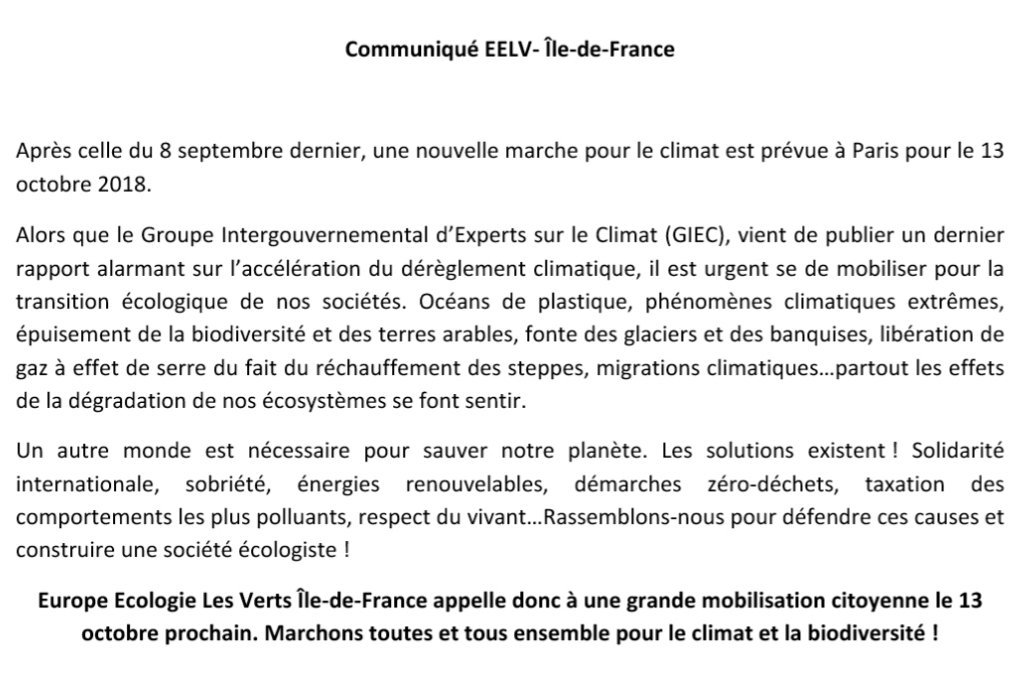 Europe Écologie les Verts Île-de-France appelle à participer à la grande mobilisation pour le climat samedi 13 octobre. Changeons le système, pas le climat !