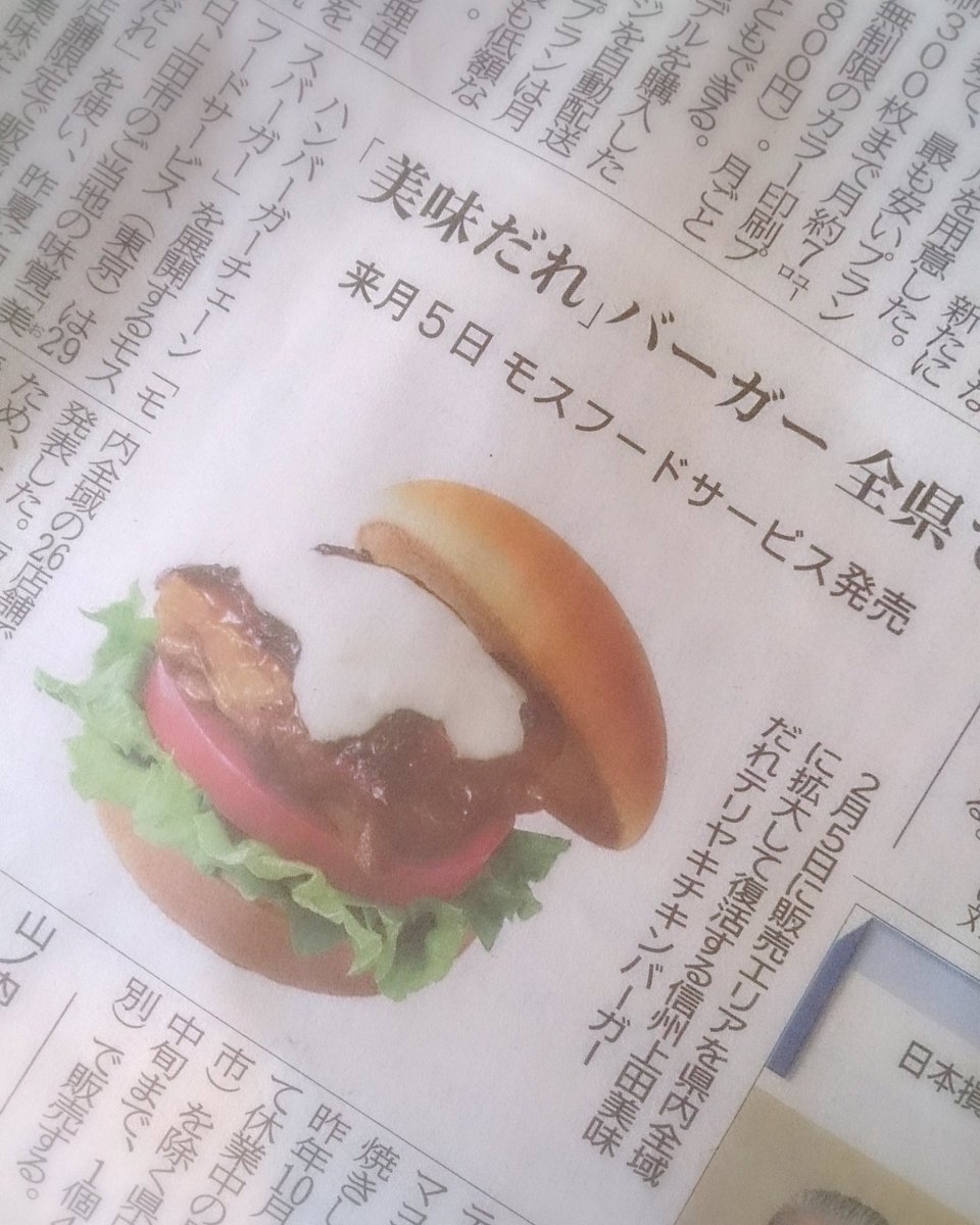 #美味だれ焼鳥 」をベースとしたモスバーガーの「美味だれテリヤキチキンバーガー」が2月5日より長野県内全域で発売決定だよ~(о´∀`о)ノ ※2020年1月30日の信濃毎日新聞より#信州上田#ONENAGANO#2020ここは行くべき14都県#美味だれpic.twitter.com/p61luIAliH