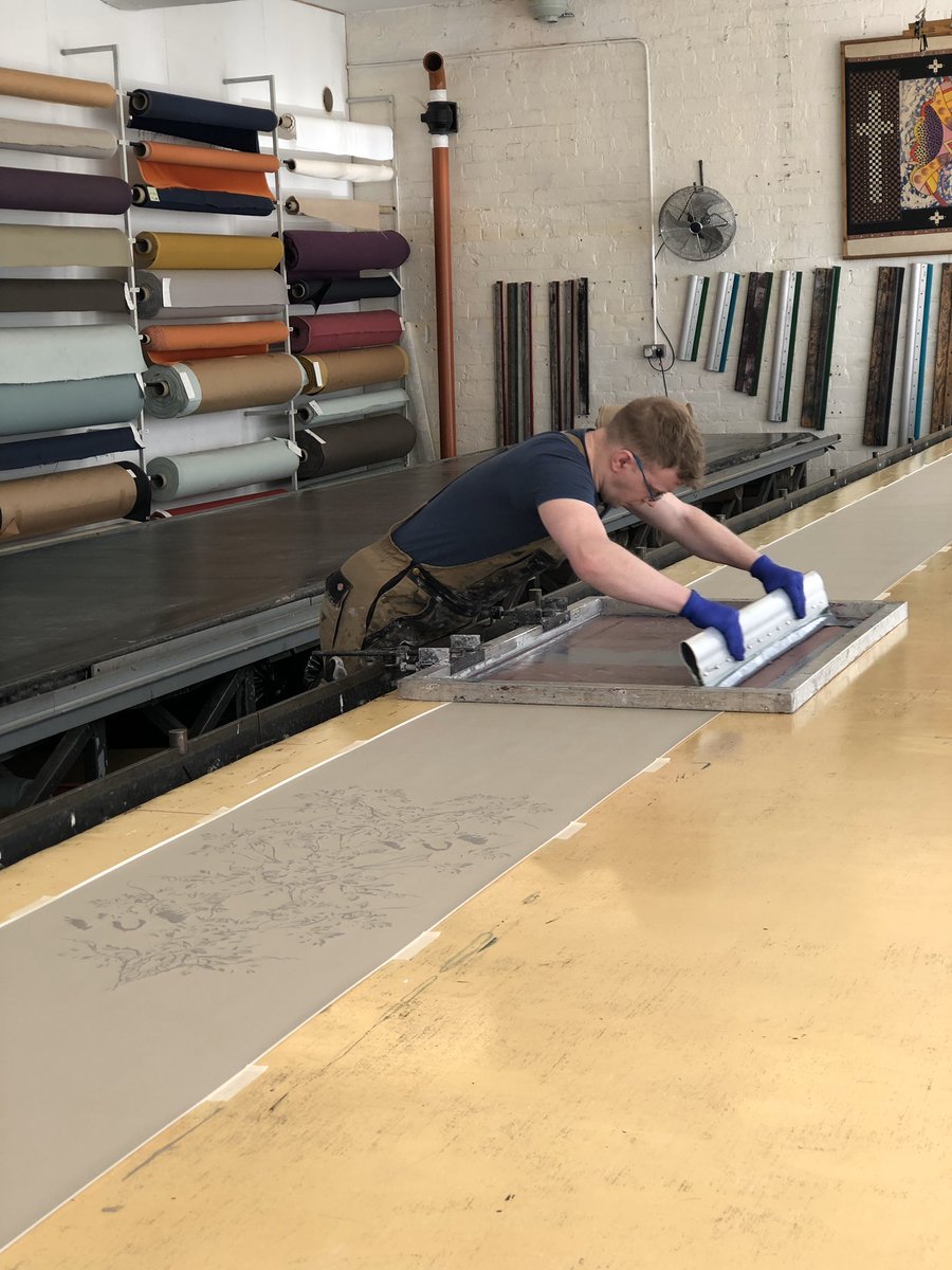 Screens 1 and 2 of Two in a Bush Wallpaper being hand printed here in our studio in Glasgow, Scotland. This design is made up of five screens and it takes a number of hours to print just 20m.