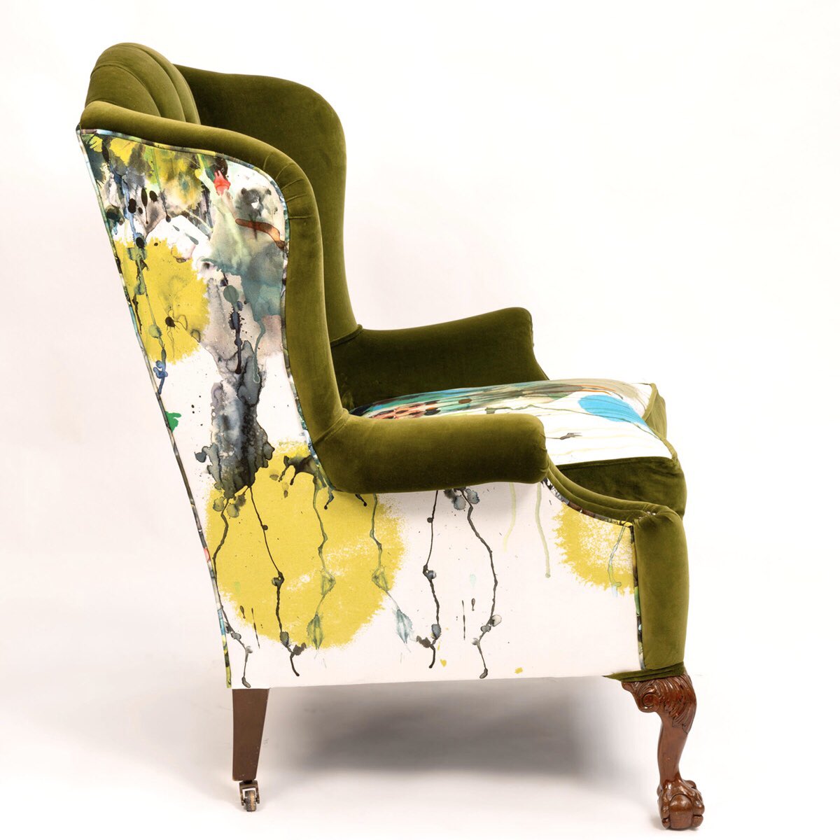 #FurnitureFriday This chair has been upholstered with a custom hand print Kaleido Splatt Fabric and olive velvet.#furniture#chair#fabric#upholstery#design#interiordesigners#pattern#TBturns30#30yearsofbeastiality pic.twitter.com/912LRQryXD