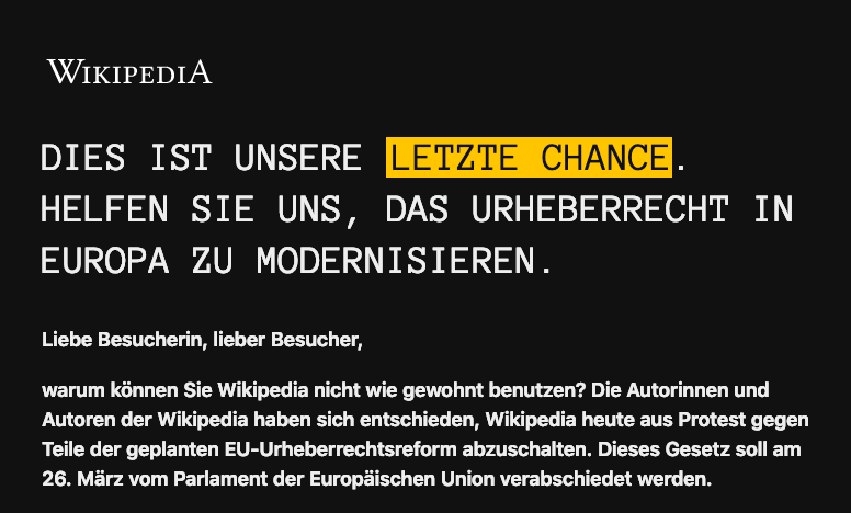 #Blackout21 Action Day. Czech, Danish, Germand and Slovak#Wikipedia is blacked out in protest.#article13 carve out protects Wikipedia from filters, but they understand the importance of a healthy broader ecosystem.#321EUOfflineDay#SaveYourInternetpic.twitter.com/wYEL5rd5K8