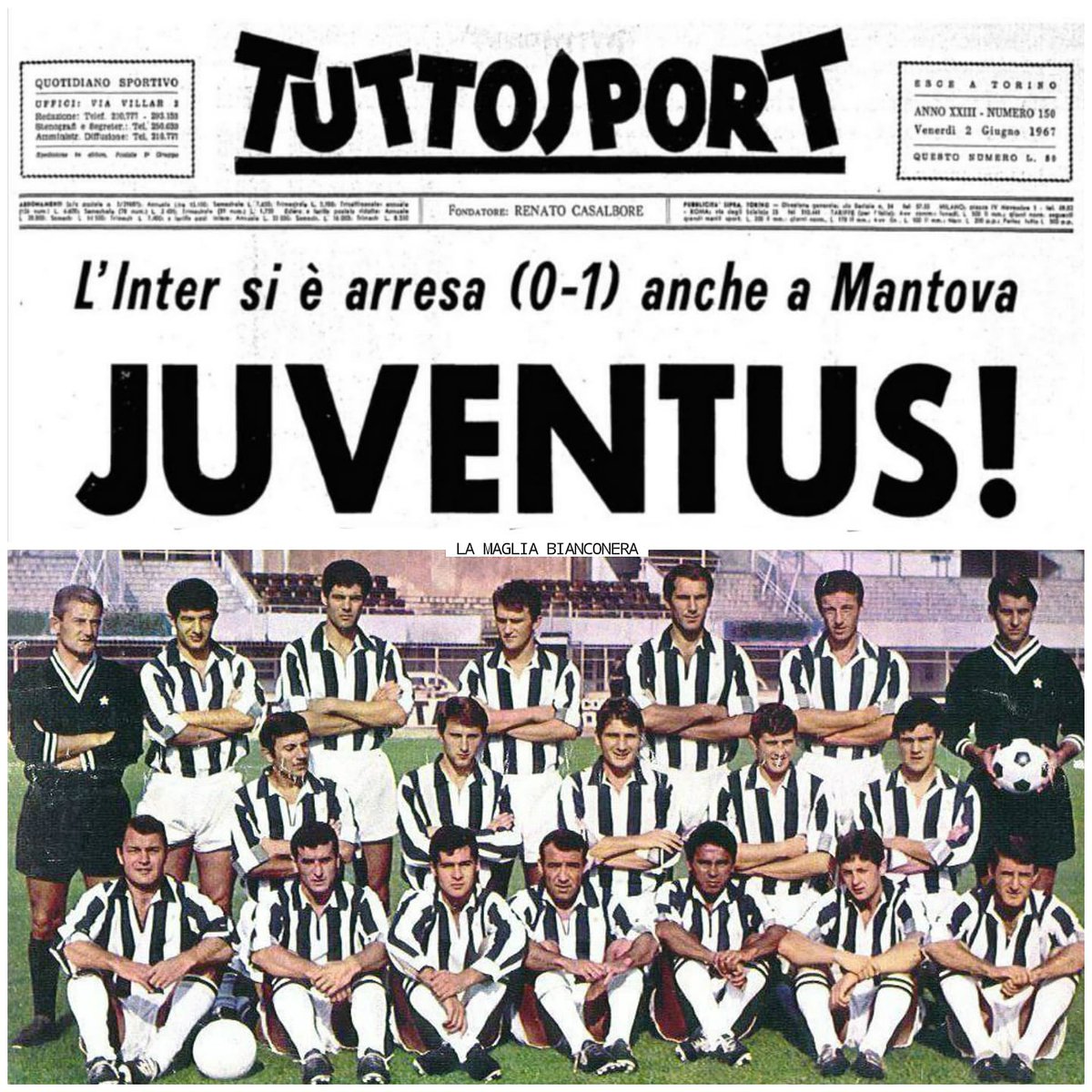 #1giugno1967, ultima giornata di#SerieA: l'Inter, in testa per tutto il campionato, perde contro un Mantova già salvo; la#Juve operaia del#Movimiento batte la Lazio che si giocava la salvezza! È sorpasso! È il 13° scudetto! È l'antenato del 2002!pic.twitter.com/P14B9QEWC4