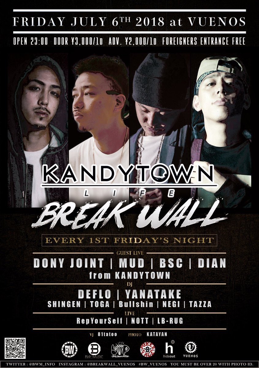 #7月】 7.6.Fri 〓BREAK WALL〓@VUENOS_CLUB OPEN 23:00 ▪︎Guest LIVE DONY JOINT MUD BSC DIAN (KANDYTOWN) ▪︎DJ DJ DEFLO DJ YANATAKE etc. ▪︎LIVE RepYourSelf NOTT LB-RUG#東京pic.twitter.com/nFQOzPn5GS