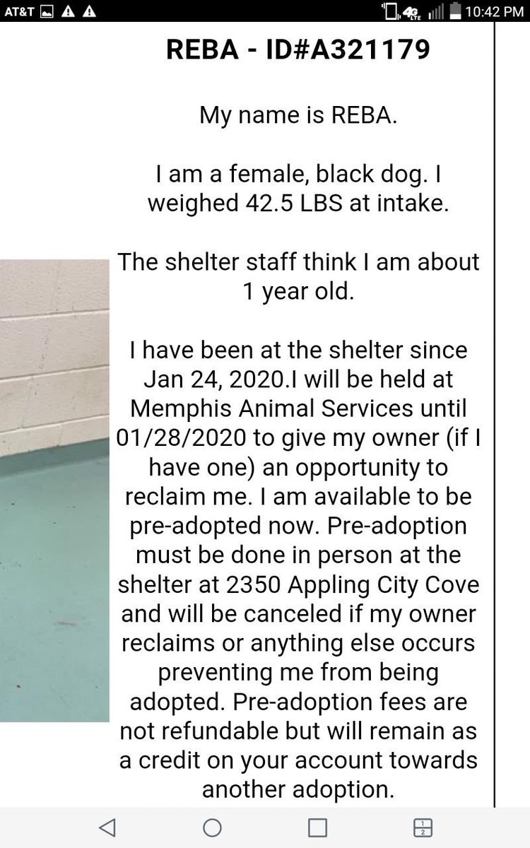 REBA NEEDS VET CARE PLEASE HELP HER GET OUT OF # TN#MEMPHIS & TO A PLACE OF SAFETY TYSM
