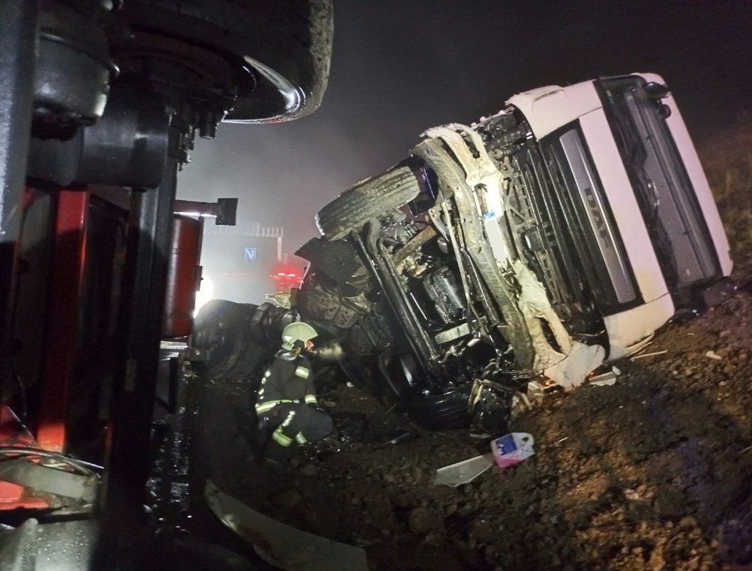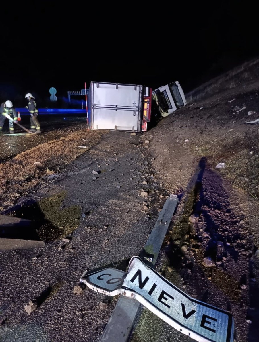 Colisión de 2 camiones con vuelco de uno en el km 150 de la