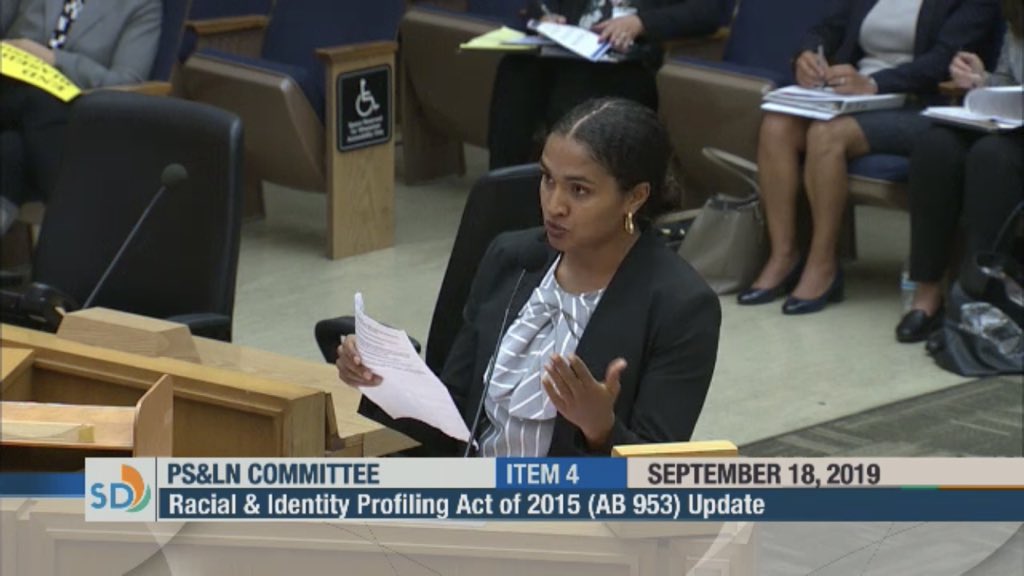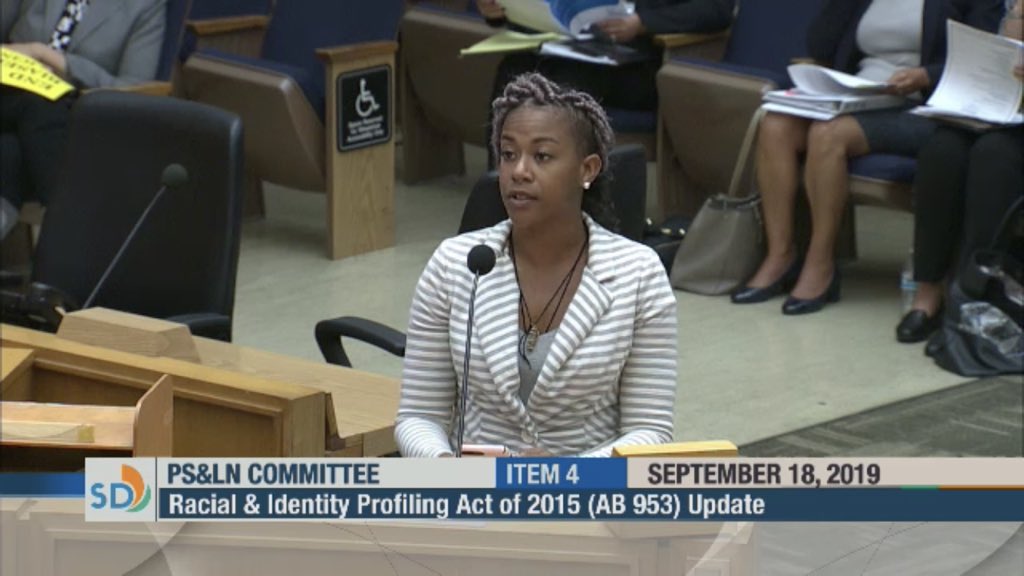 @sdACLU Policy Associate Chelsey speaks at SD City Council’s PSLN committee hearing on the need for us to do better to end biased policing. “Police bias is real. The pain that it causes is real.”#AB953 pic.twitter.com/wgIhGQen3E