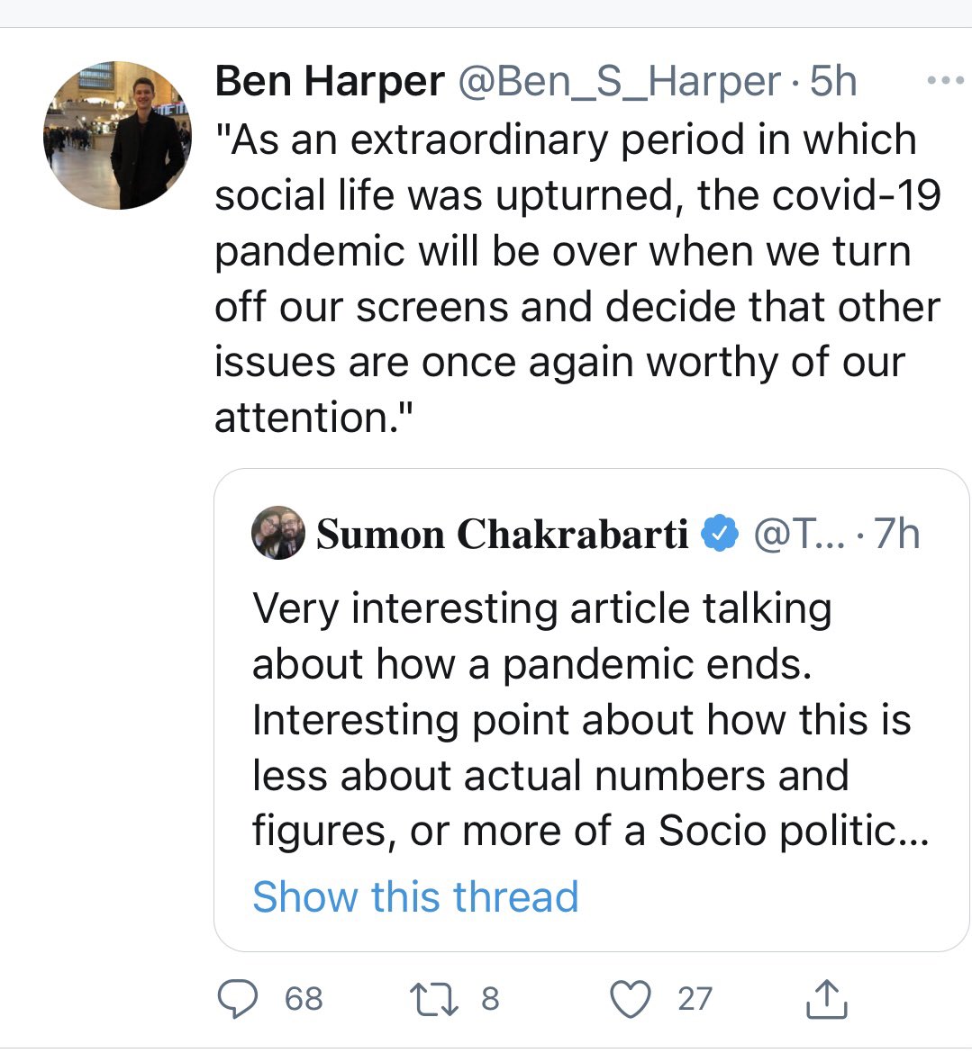 The daily “Winner of the biggest douche bag on Twitter” award goes to Ben Harper who thinks that this COVId pandemic will magically go away if we just stop looking at “our screens.” Conservatives just love spreading