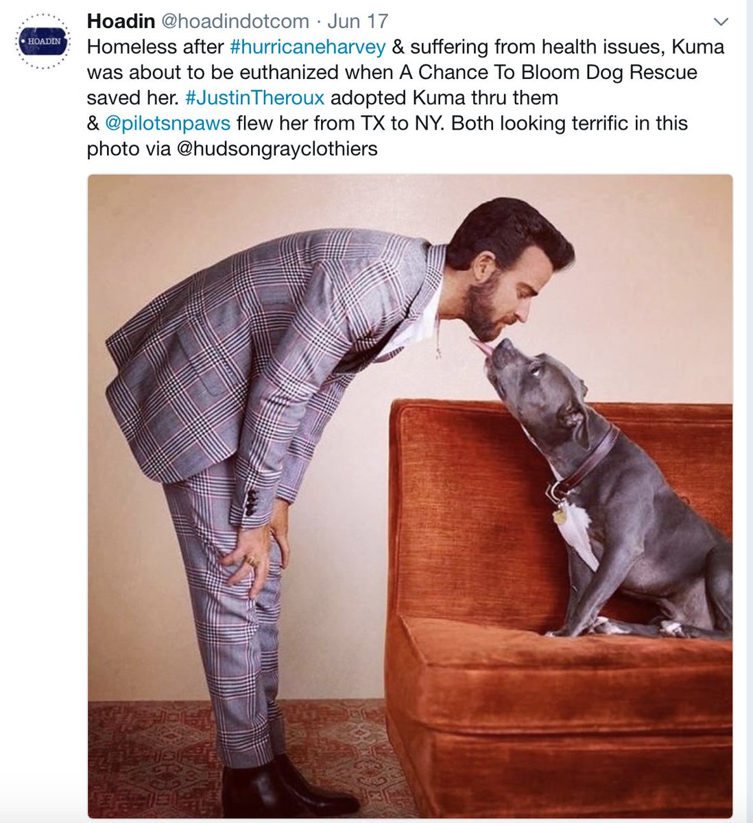 #JustinTheroux adopting Kuma an abandoned Pit Bull continues creating awareness of the importance of#AnimalRescue#Adoption &#PNP flights to fur-ever homes. We're#grateful.@PamGrier@abanajacobs@louwegner@joshgroban@carrieanninaba@SternBeth@LoisPope1@AaronOConnell pic.twitter.com/rkZyYwDsLB