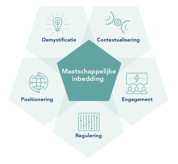 Het inbedden van een systeemtechnologie als AI vereist een integrale aanpak, met intensieve betrokkenheid van de overheid. De WRR onderscheidt daarbij vijf opgaven: demystificatie, contextualisering, engagement, regulering en positionering.