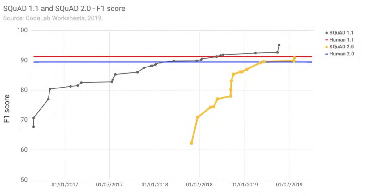 #NLP one popular benchmark is Stanford Question Answering Dataset (SQuAD) challenge. This is a reading comprehension dataset, consisting of Qs posed by crowdworkers on a set of Wiki articles. Significant improvement in recent years!@indexingai#AIIndex2019#AIpic.twitter.com/VQeItuwmlF